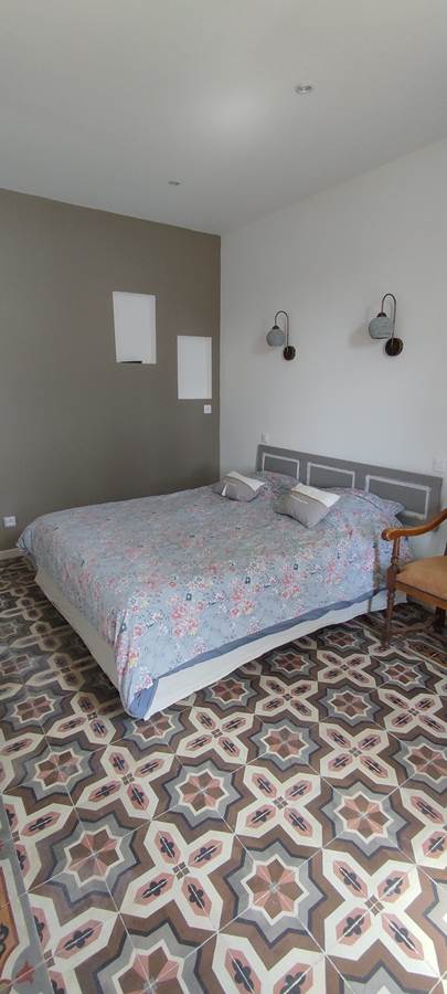 Idéal pour un séjour en duo, le gîte du Mas vous accueille dans un espace confortable, lumineux et parfaitement agencé. Vous y découvrirez une spacieuse chambre au charme authentique, sublimée par de magnifiques carreaux de ciment d'époque, conservés depuis la construction du Mas. Une touche patrimoniale rare, qui confère au lieu une atmosphère unique et pleine de caractère.